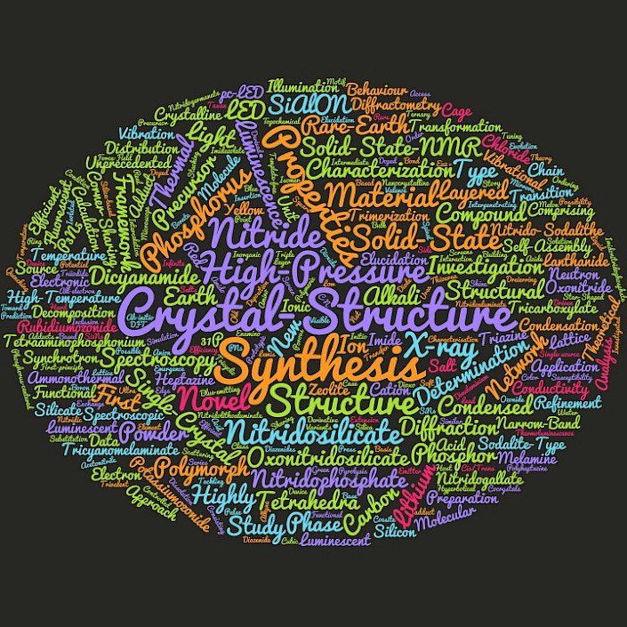 Recent research highlights of the Schnick group include novel synthetic approaches to nitridosilicates and nitridophosphates, structure elucidation of binary α-P3N5 and its high-pressure polymorph γ-P3N5, discovery of the first nitridic zeolites (NPO and NPT) and clathrate structures, ab-initio structure determination of important C3N4-precursor compounds e.g. melam, melem, and melon as well as the 2-dimensional polymeric carbon nitride-type materials poly(heptazine imide) and poly(triazine imide).